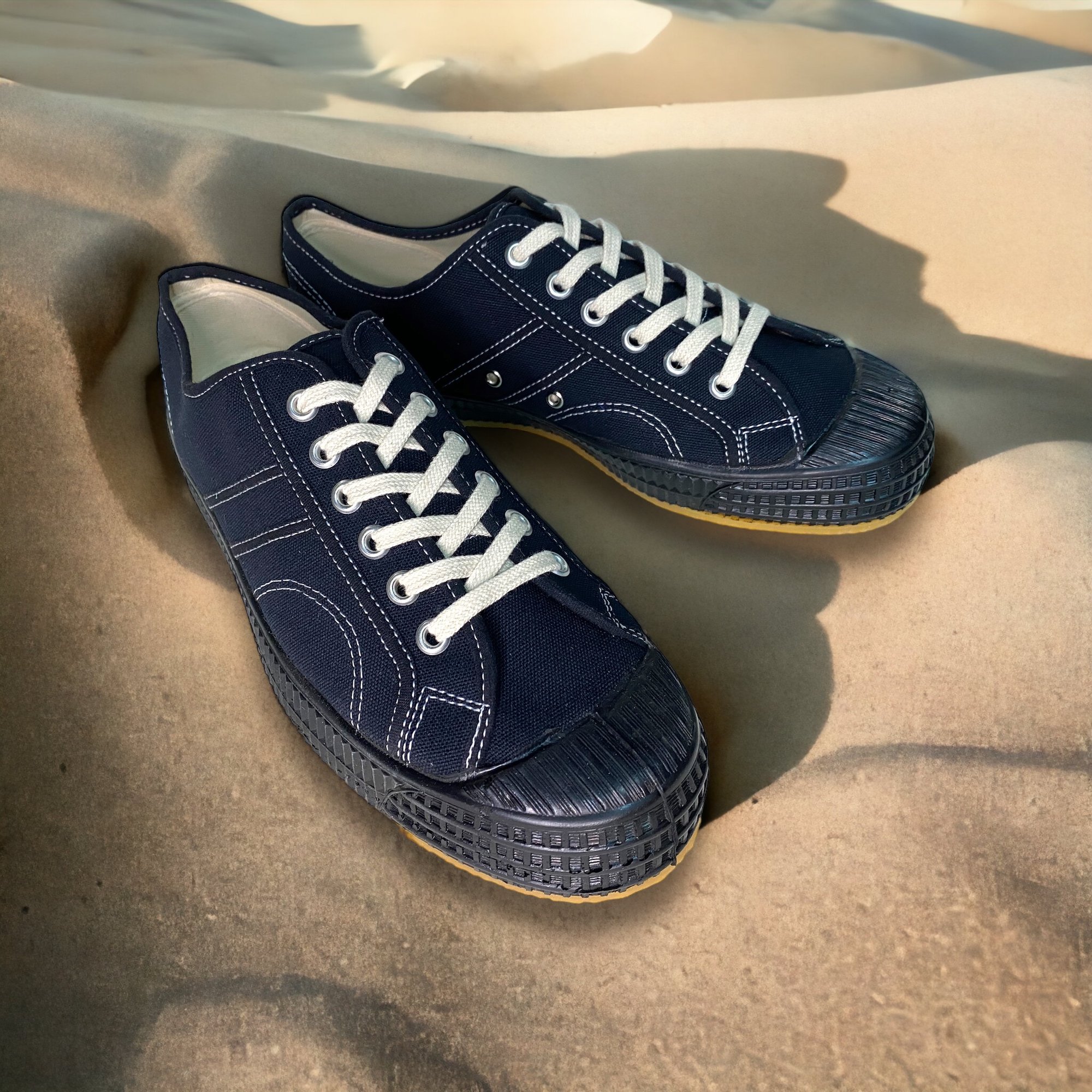 The natural rubber sole is machine-pressed by heat onto the body of the sole. This process results in the tire marks around outsole. This made the shoes more durable and won’t break easily.